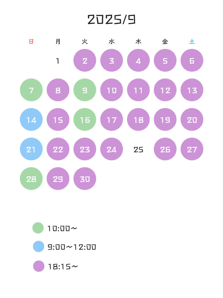 9月の営業日 Uncategorized Twitter Facebook はてブ Pocket LINE コピー 2025.09.022025.08.30 9月の営業日カレンダーになります。公式LINEでは月末に来月分の営業日カレンダーを送らせて頂いてますので、ぜひご利用ください!完全予約制になりますので、ご予約のうえご来院をお待ちしております☺️