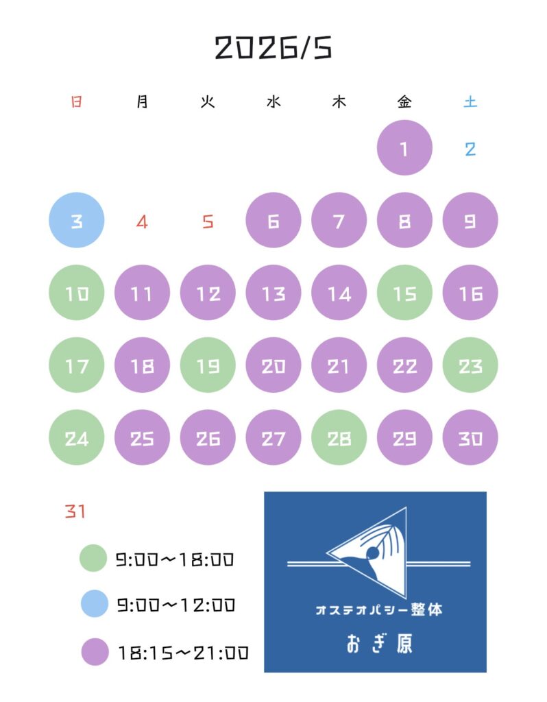 5月の営業日 Uncategorized Twitter Facebook はてブ Pocket LINE コピー 2026.04.28 5月の営業日カレンダーになります 5月より1日営業および午前営業日は9時から、夕方以降からの営業日の場合は18:15〜21:00までと、営業時間を変更させて頂きました。 ご予約やお問い合わせはLINEまたはお電話でお待ちしております! 電話の場合は留守番電話にメッセージを残していただけると非常に助かります🙇よろしくお願いいたします。 皆様のご来院心よりお待ちしております。
